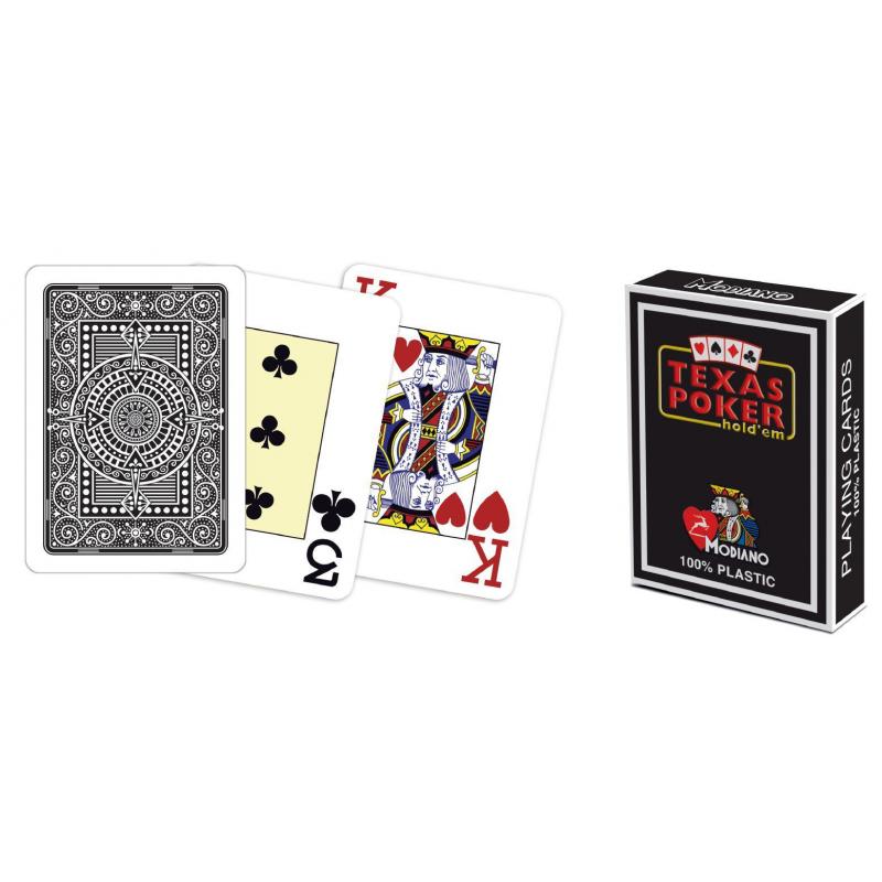Kvalitní pokerové karty ze 100% plastu oblíbené značky Modiano. Karty mají klasický širokoúhlý formát, jsou 8,89 cm vysoké a 6,35 cm široké. Karty jsou dvourohé - tedy v protilehlých rozích je uvedena hodnota karty.
