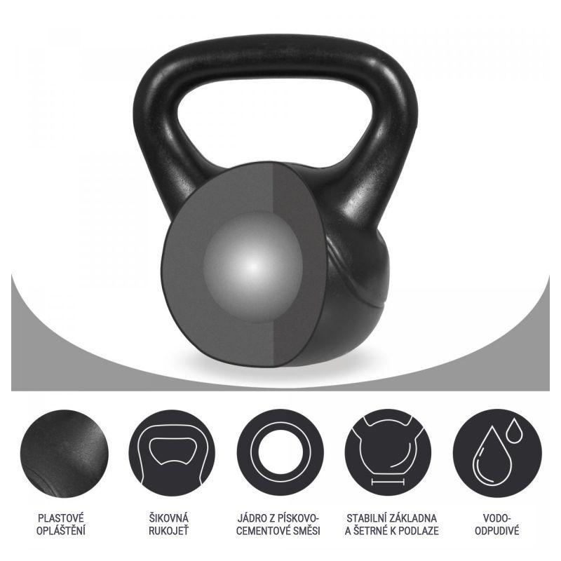 Efektivní trénink nezávisí na velkém a objemném vybavení, které se nevejde ani do vašeho obývacího pokoje. Můžete trénovat opravdu efektivně i při malém prostoru, pokud víte, jak cíleně používat své tělo. Provedení kettlebell zaujme stylovým a praktickým povrchem, který chrání nejen vaši podlahu. Kettlebell lze během tréninku použít různými způsoby. Na začátku tréninku byste se měli vždy dobře rozcvičit a začínat s lehčím kettlebellem.