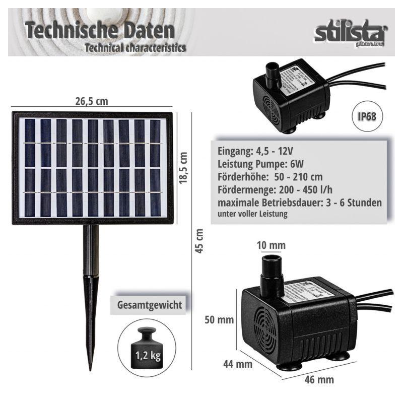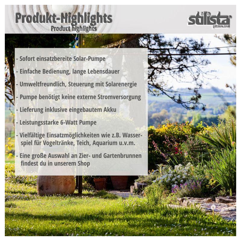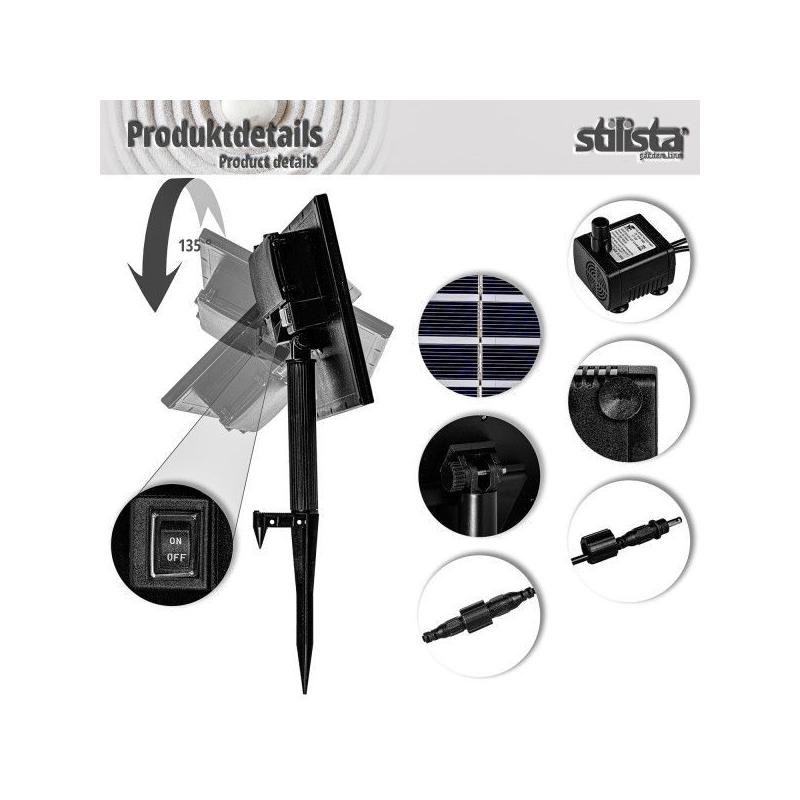Díky čerpadlu s hladkým chodem voda běží v okruhu, takže není nutné žádné připojení k vodovodnímu řádu. Solární čerpadlo je vybaveno dobíjecí baterií, s níž může být v provozu až 6 hodin. Solární čerpadlo nabízí širokou škálu dalších možností využití jako vodní prvek pro ptačí koupele, jezírka , akvária.