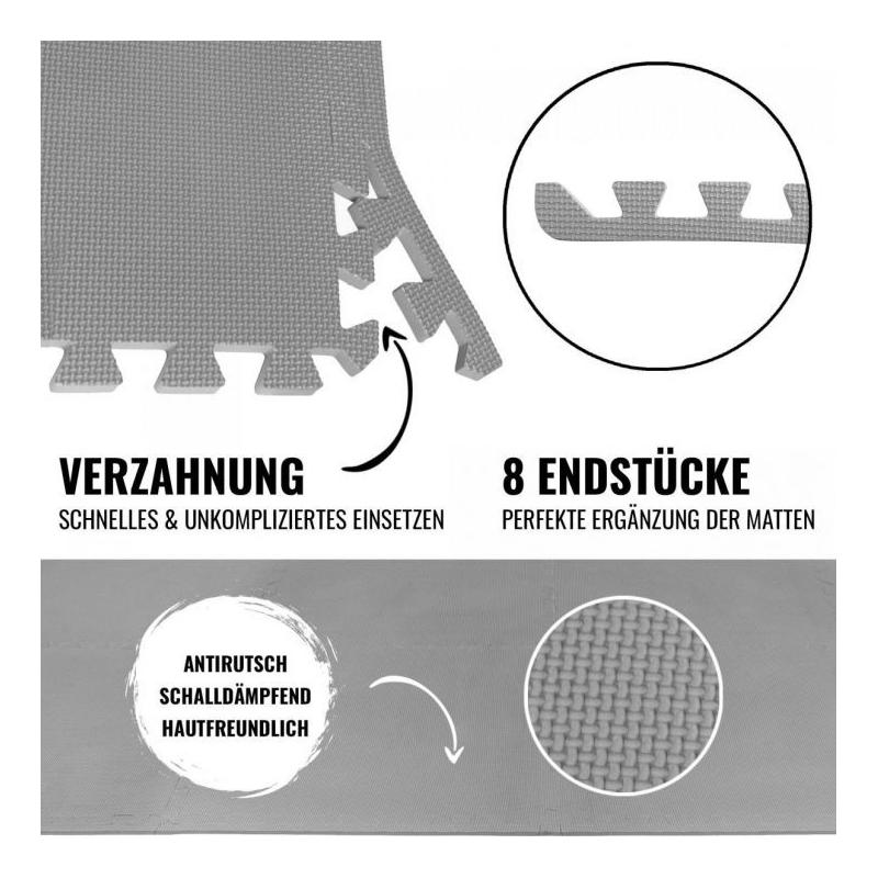 Koncovky jsou vyrobeny z vysoce kvalitní pěny šetrné k pokožce. Jsou otíratelné a snadno se čistí. Stejně jako ochranné rohože jsou i koncovky oděruvzdorné a neklouzavé, poskytují vám a vašemu vybavení pevný základ. Chrání vaši podlahu, zahřívají, když je povrch studený a tlumí hluk, který se objevuje během tréninku.