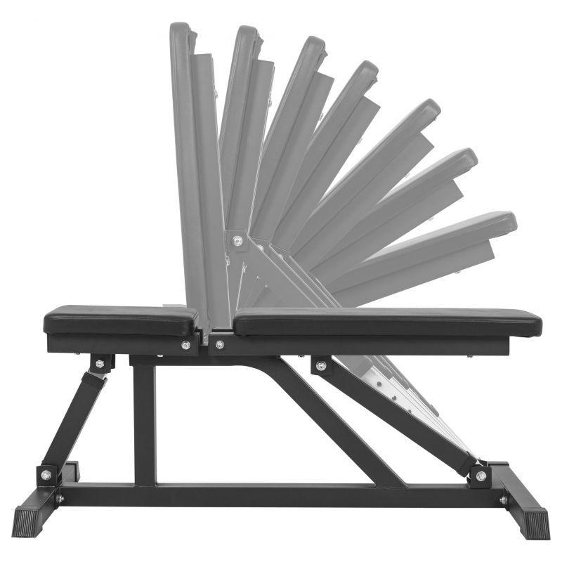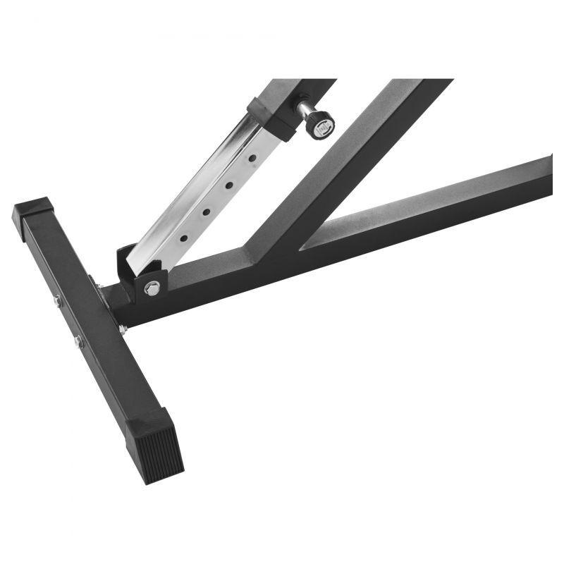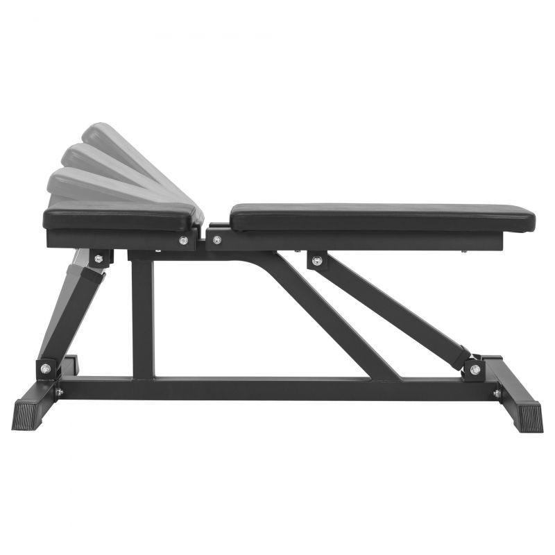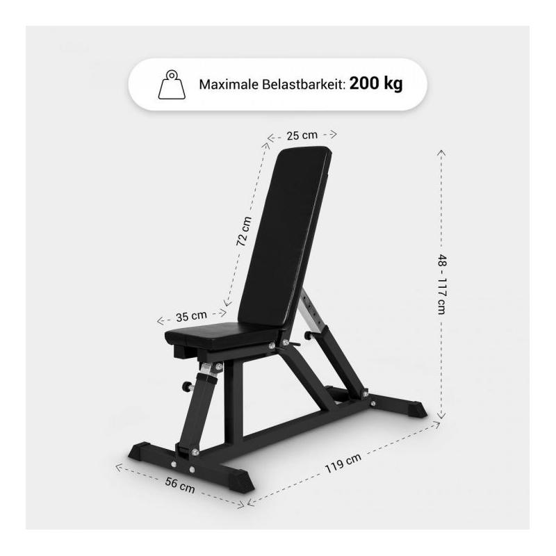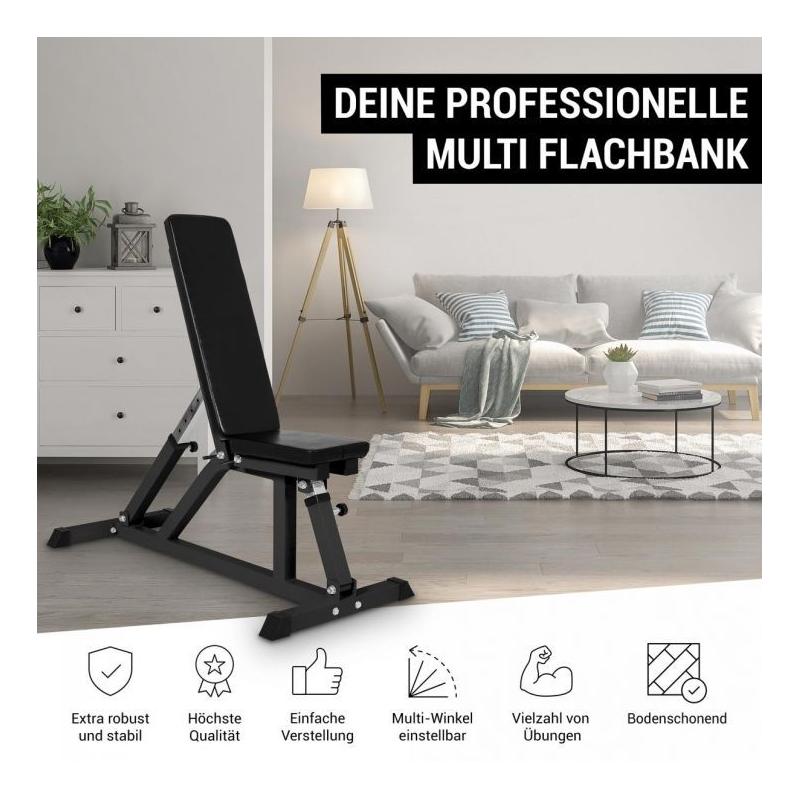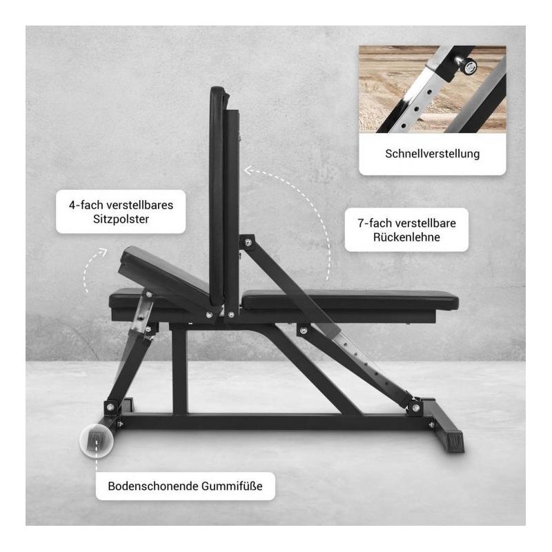 Na ploché lavici můžete provádět cviky jako bench press (i šikmý), front press nebo bicepsové zdvihy. V zásadě můžete provádět všechna cvičení, která vyžadují, abyste seděli nebo leželi. Rychloupínací šroub umožňuje nastavit dokonalý úhel v jednom snadném kroku a poté se uzamkne na místě, takže můžete pracovat s těžkými závažími. Nožky chránící podlahu jsou pogumované, takže je zaručeno bezpečné postavení.