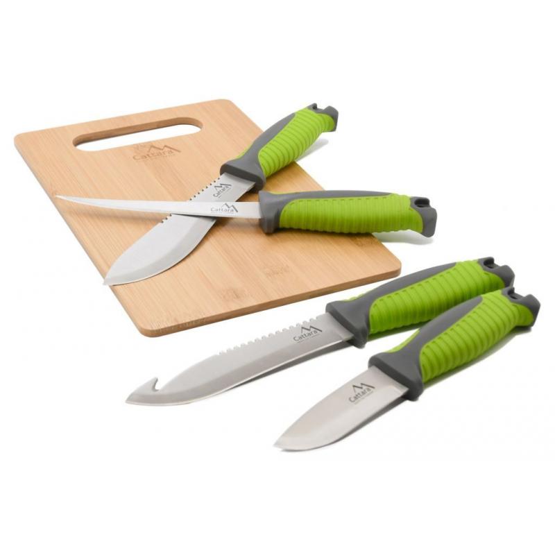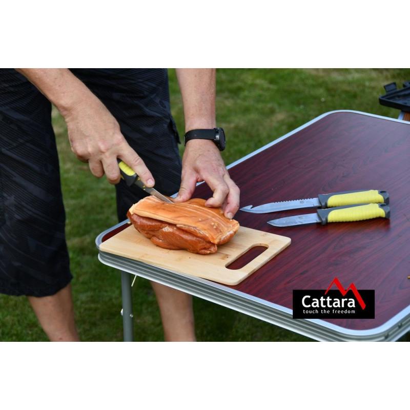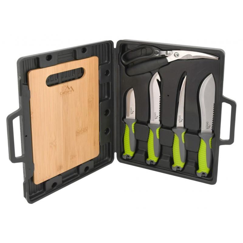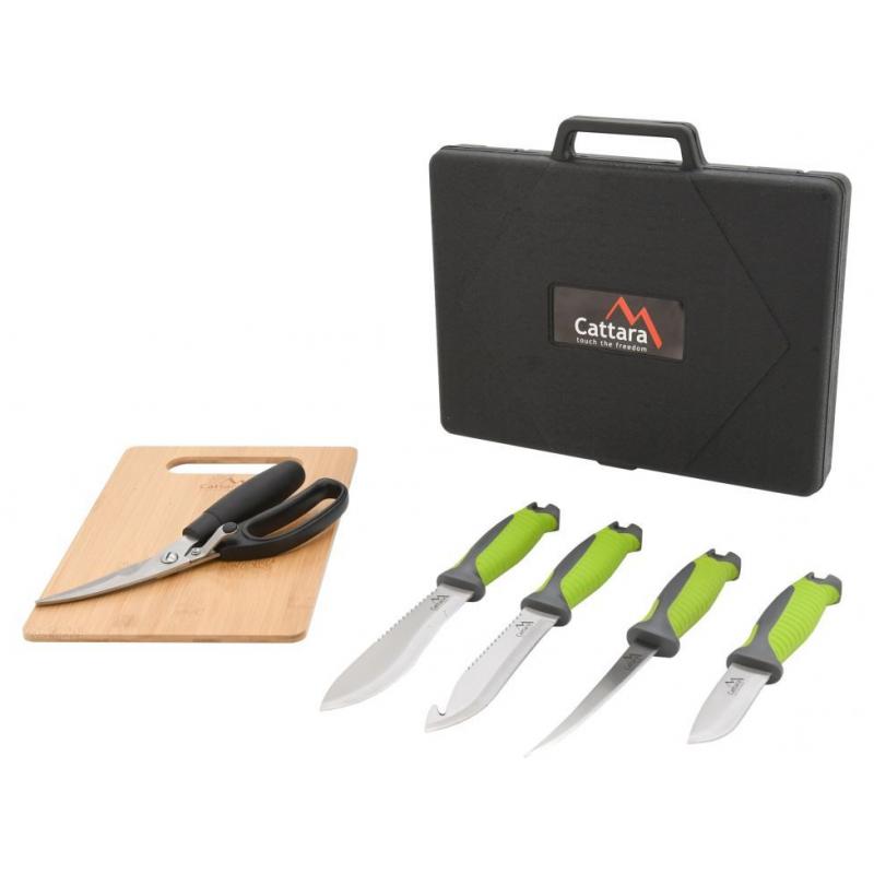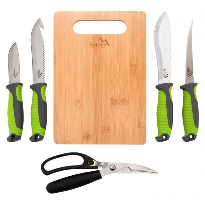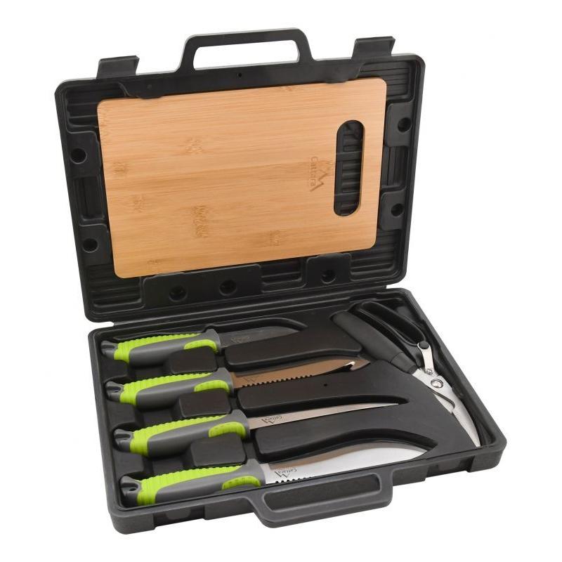 Grilovací sada skládající se ze 4 ks nožů, nůžek na drůbež a ryby a prkénka pro pohodlné porcování. Malý, střední, velký a filetovací nůž je vyroben z kvalitní nerezové oceli s plastovou, ergonomicky tvarovanou rukojetí s pogumovaným povrchem. V sadě jsou i praktické nůžky na drůbež, či ryby s posunovací pojistkou. Jsou opatřeny širokou rukojetí pro pohodlné držení a následné porcování. Nůžky jsou vyrobeny z kvalitní nerezové oceli, stejně jako nože. Dalším prvkem sady je bambusové prkénko pro pohodlné porcování. Celá sada je úhledně umístěna v transportním kufříku. Sadu tak využijete jak doma na zahradě, tak i na cestách.