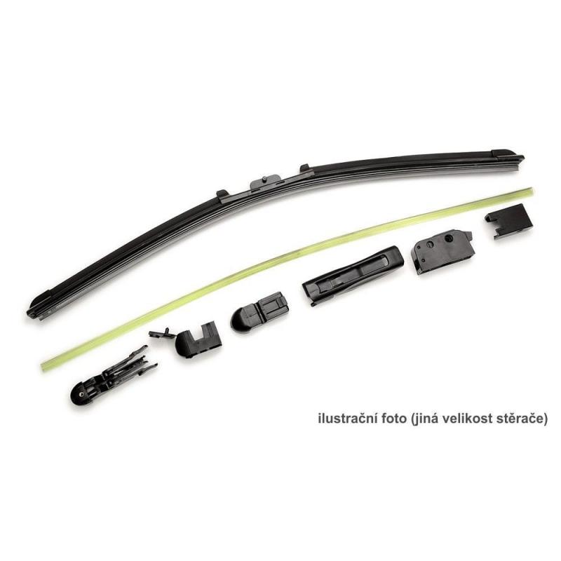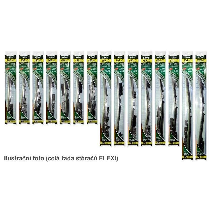 Plochý stěrač FLAT FLEXI, baleno v průhledném plastovém obalu. Obsahuje celou řadu adaptérů, díky kterým je snadné stěrač upevnit na většinu běžně používaných zakončení ramének stěračů. Stěrač je vybaven grafitovým břitem pro výtečné stírání.