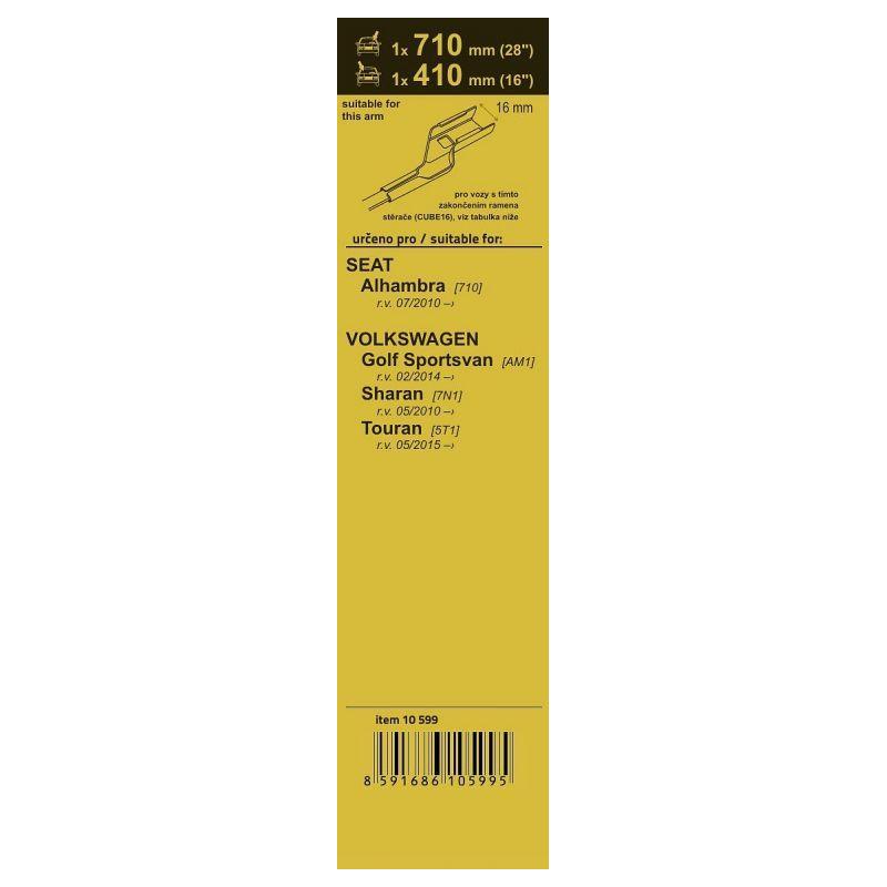 Sada dvou plochých stěračů FLAT (řidič + spolujezdec) se speciálním uchycením. Délky stěračů a systém uchycení na ramínko jsou přizpůsobeny vybraným vozům (viz tabulka použití). Vysoce kvalitní pružný člen plochého stěrače zajišťuje stejnoměrný tlak grafitového břitu v celé jeho délce.