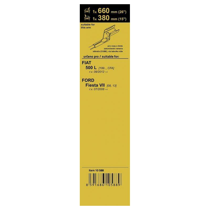 Sada dvou plochých stěračů FLAT (řidič + spolujezdec) se speciálním uchycením. Délky stěračů a systém uchycení na ramínko jsou přizpůsobeny vybraným vozům (viz tabulka použití). Vysoce kvalitní pružný člen plochého stěrače zajišťuje stejnoměrný tlak grafitového břitu v celé jeho délce.