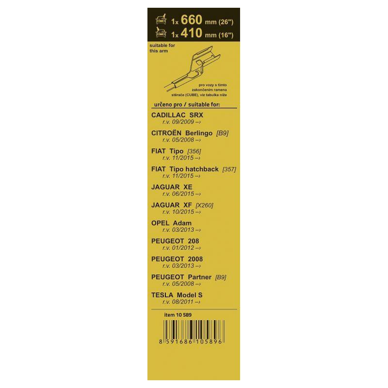 Sada dvou plochých stěračů FLAT (řidič + spolujezdec) se speciálním uchycením. Délky stěračů a systém uchycení na ramínko jsou přizpůsobeny vybraným vozům (viz tabulka použití). Vysoce kvalitní pružný člen plochého stěrače zajišťuje stejnoměrný tlak grafitového břitu v celé jeho délce.