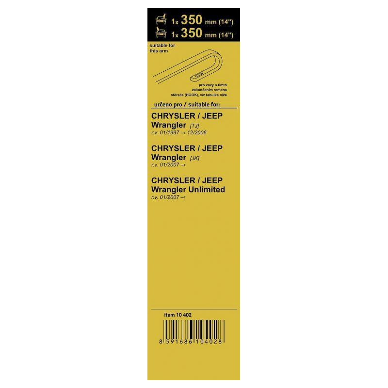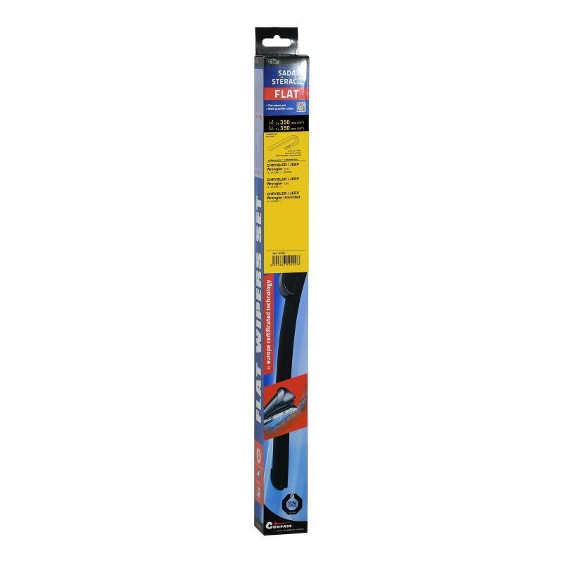 Sada dvou plochých stěračů FLAT (řidič + spolujezdec) se speciálním uchycením. Délky stěračů a systém uchycení na ramínko jsou přizpůsobeny vybraným vozům (viz tabulka použití). Vysoce kvalitní pružný člen plochého stěrače zajišťuje stejnoměrný tlak grafitového břitu v celé jeho délce.