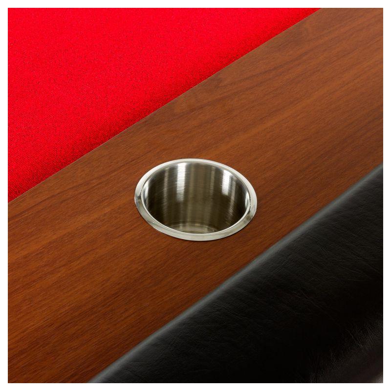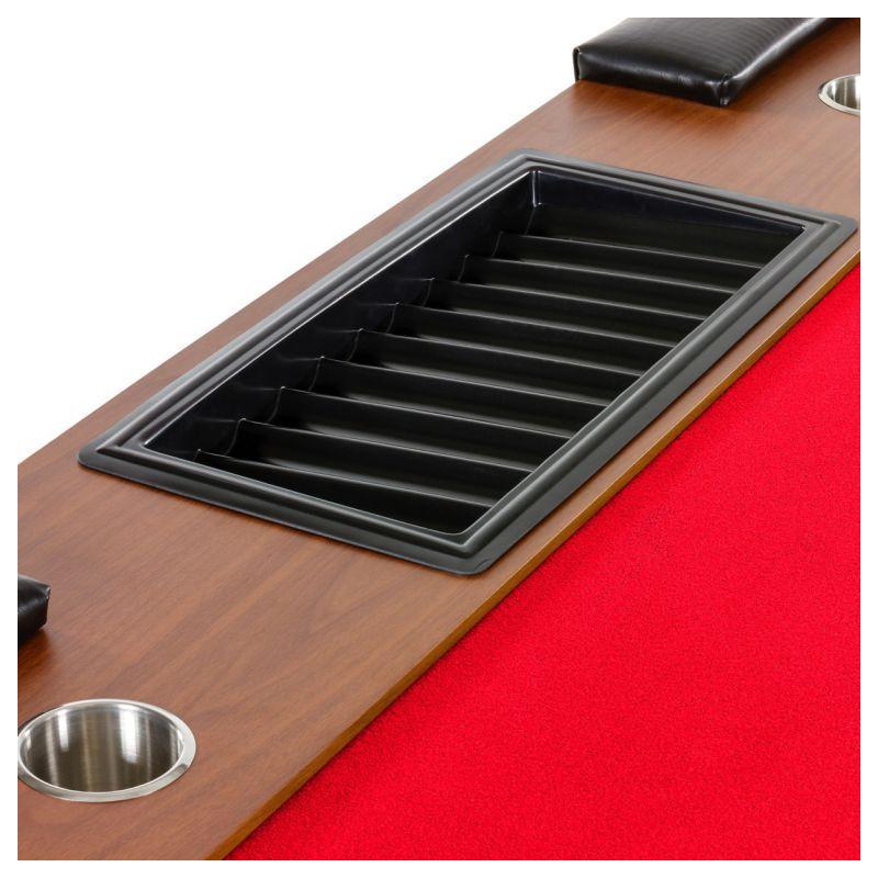 Deska stolu je velmi robustní, z jednoho kusu, o tloušťce 18 mm MDF desky. Půlkruhové masivní nohy z MDF zajišťují optimální stabilitu. Široká polstrovaná opěrka je připevněna k okraji stolu. Kromě toho, deska má více než 9 držáků nápojů z nerezové oceli. Vnitřek stolu je z mahagonového dřeva a nabízí dostatek prostoru pro uložení pokerových žetonů. Dokonalý zážitek z kasina tak může začít během několika minut!