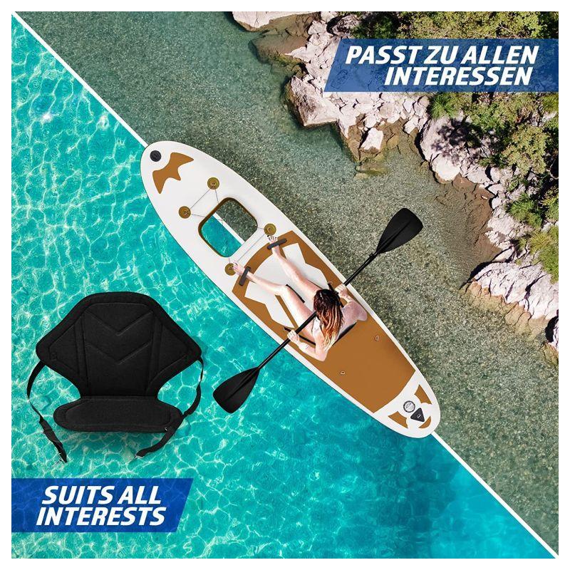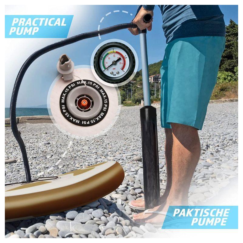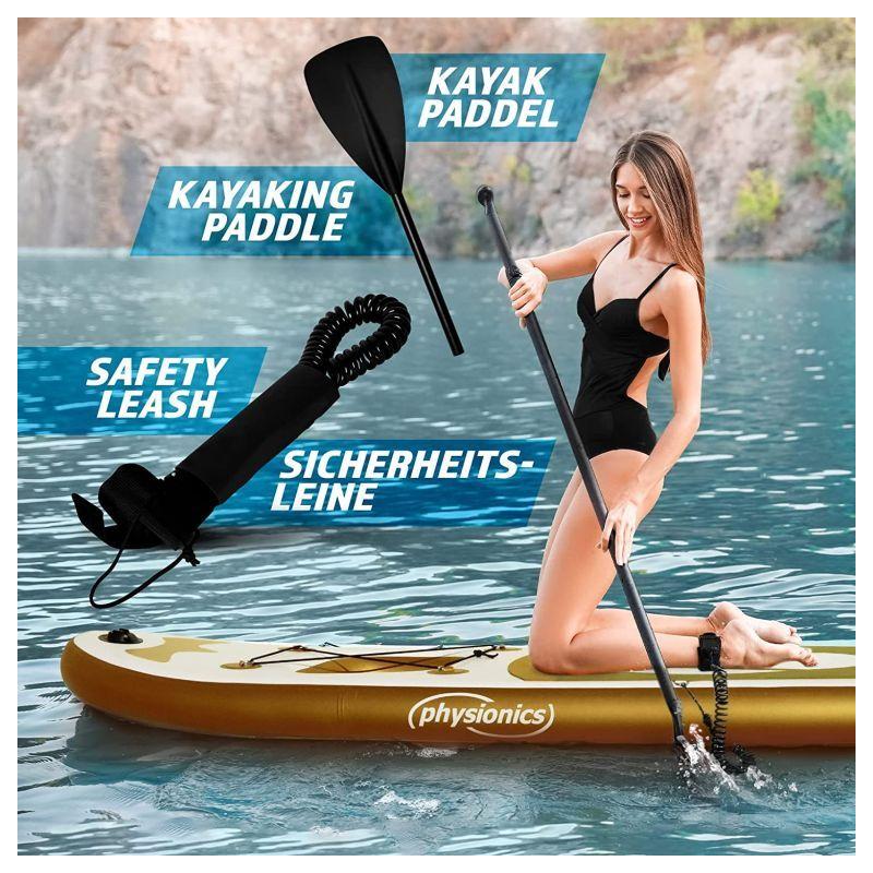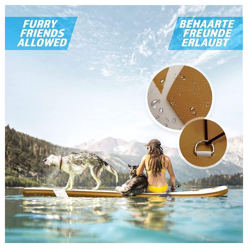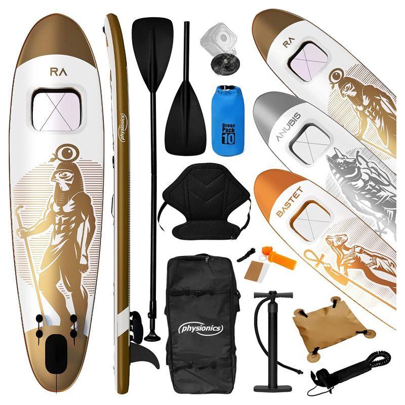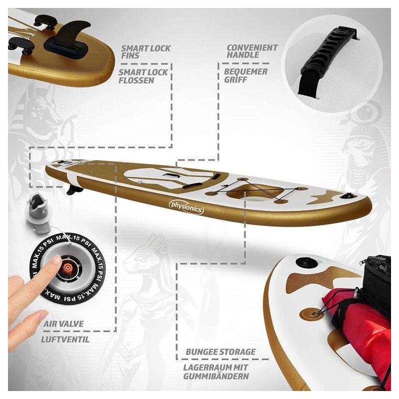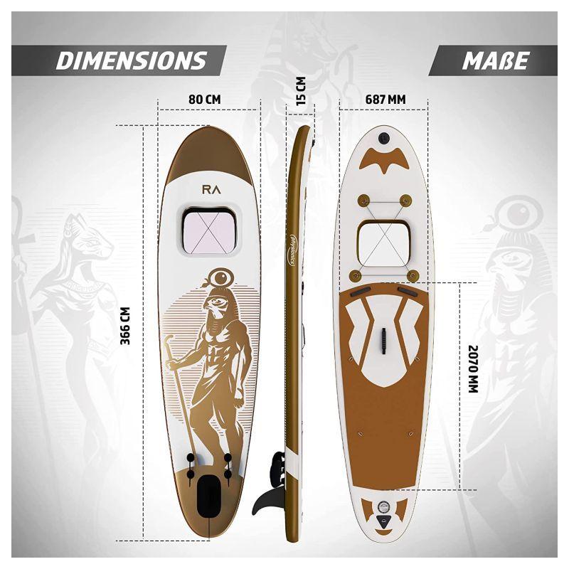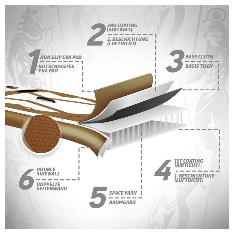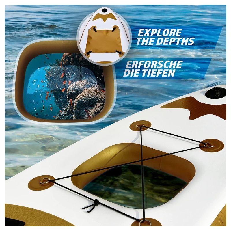 Deska je vyrobena z materiálu PVC, kterým je zesílena technologií Drop Stitch a slibuje trvanlivost. Má průhledné okno, sedadlo na kajaku, úložný prostor, tři ploutve, praktickou rukojeť, neklouzavou a měkkou pěnou EVA s širokou plochou stojanu. Má na rozdíl od mnoha jiných modelů na trhu, držák kamery na horní straně desky pro všechny, kteří chtějí natáčet svá dobrodružství. Dodává se výsuvným dvojitým pádlem, bezpečnostním vodítkem, pumpou, batohem, voděodolnou taškou a sadou na opravu.