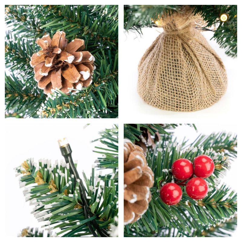 Malý praktický umělý vánoční stromek s osvětlením zkrášlí každý interiér. Je umístěn v jutovém pytli, velice krásně nazdoben šiškami a bobulemi, a je zasněžený umělým sněhem. Stromek je doplněn také o 50 světýlek.