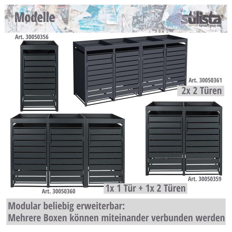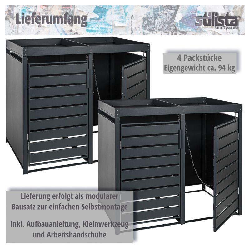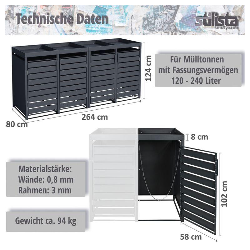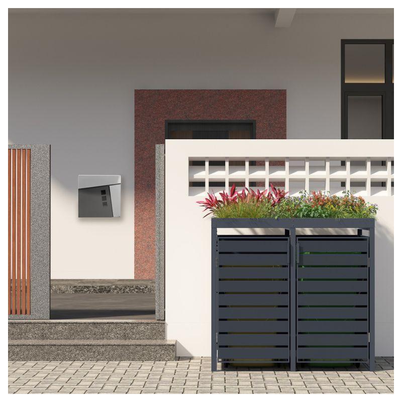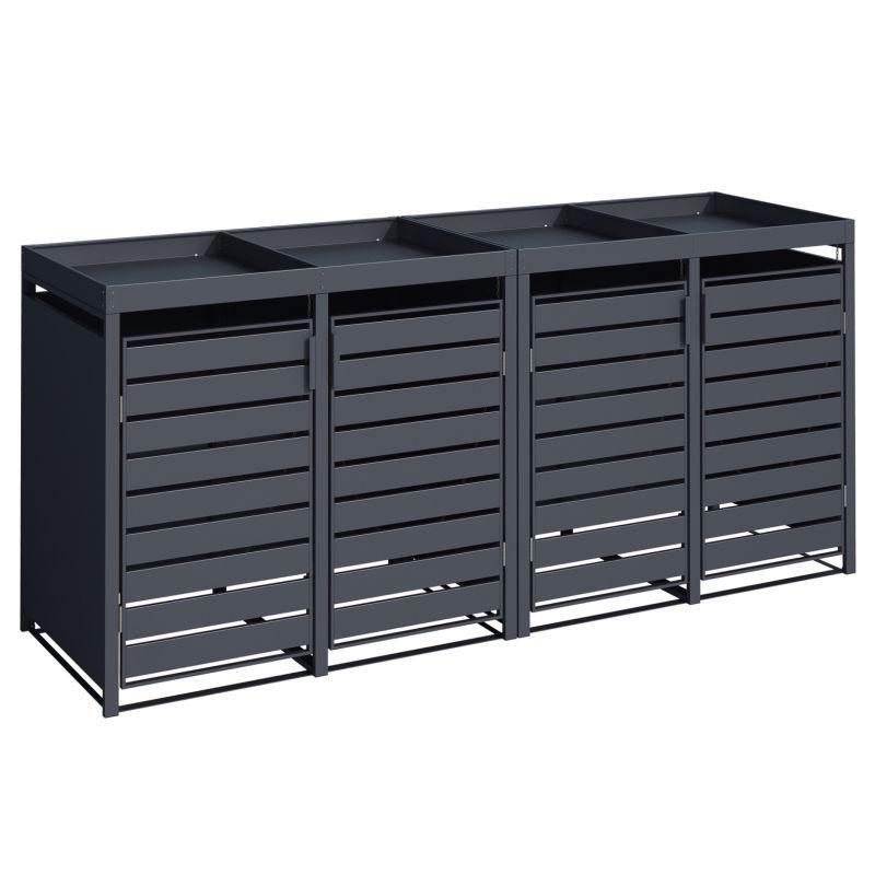Skříň STILISTA pro odpadové nádoby nabízí prostor pro čtyři odpadkové koše o objemu až 240 litrů. Díky přihrádkám na rostliny na střeše boxu na odpadky si jej můžete zkrášlit podle svých představ. Odtokové otvory na střeše pro rostliny umožňují lepší odtok vody, takže květinám a bylinkám nehrozí podmáčení. Užitečné větrací štěrbiny umožňují cirkulaci vzduchu a zabraňují vzniku nepříjemných pachů v krytu. Skříň na odpadové nádoby je k dispozici pro jeden, dva, tři nebo čtyři odpadkové koše.